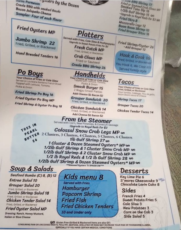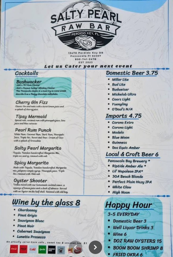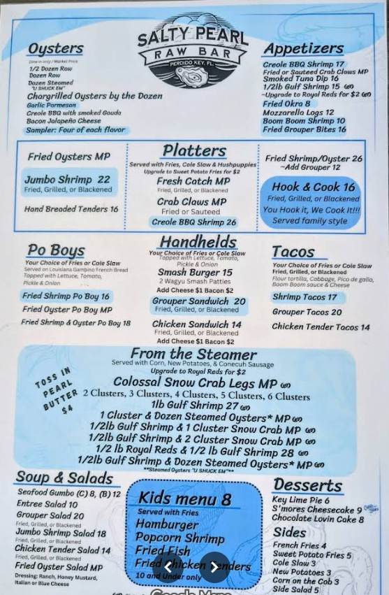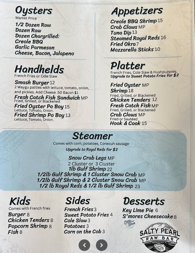 Welcome to your complete guide to the Salty Pearl Raw Bar and Steamer Restaurant menu, a top-rated seafood destination in Pensacola, Florida. Known for its fresh oysters, steamed seafood, and laid-back coastal vibe, this restaurant offers a wide variety of delicious options for seafood lovers. In the Salty Pearl Raw Bar and Steamer Restaurant menu, you’ll find everything from raw bar favorites and shrimp platters to hearty steamer pots and signature dishes made with fresh, locally sourced ingredients. Whether you’re planning your visit or simply exploring the menu, this guide provides updated prices and highlights to help you choose the best dishes for your next meal.